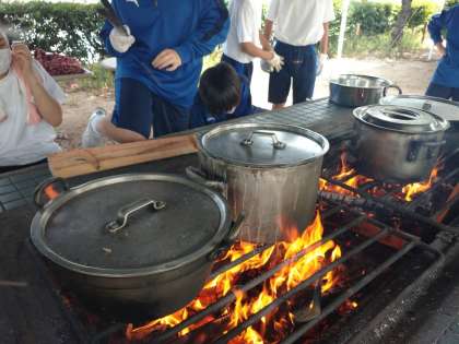 火をおこしてる人、お米を研いでる人、食器を洗ってる人、野菜やお肉を切ってる人、手分けして、どんどん他の人を手伝って、