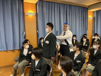 2年生の人権学習の一環で資格障がいについて学びました。講師には全盲である濱崎雄三さんにお越しいただきました。障がいのイメージがガラっと変わるような、楽しい学びがそこにはありました。最後にら歌のサプライズも!!