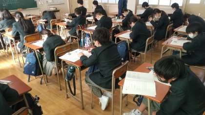 3学期始まってすぐのテストでもあり、慣れない中、生徒たちは、しっかりと問題に取り組んでいました。この頑張りが結果に出ることを祈っています。