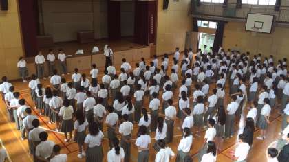 校長先生から、季節の移り変わりの話と明日から始まる9月に向けての心構えのお話しがありました。その後、表彰状の伝達式が行われ、8月後半に活躍したクラブに表彰状や優勝カップが授与されました。