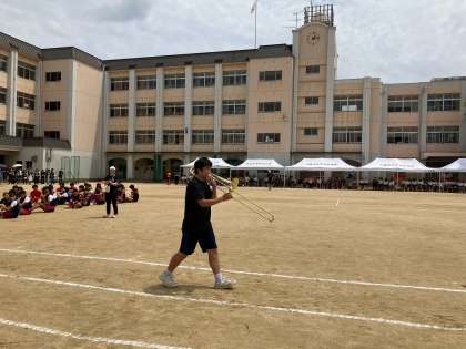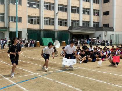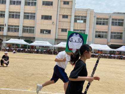 午後の部は部活動対抗リレーから始まりました。文化部の特徴あるバトンが、仲間に渡されていきます。