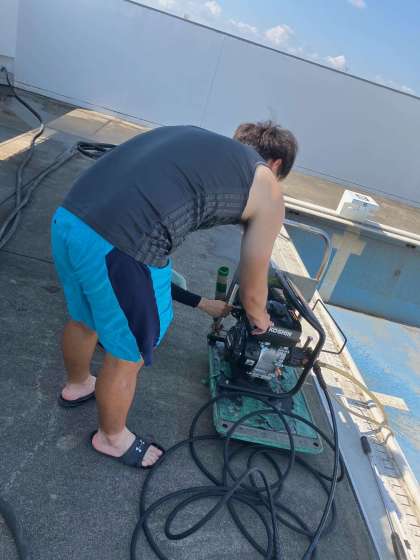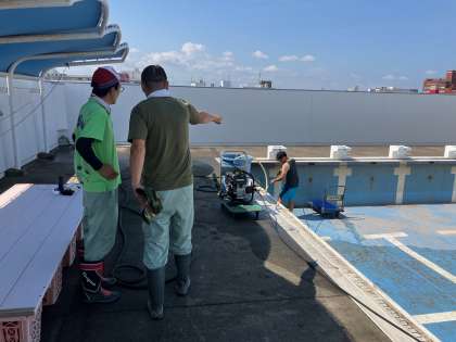 今日から、本校の管理作業員さんと体育科の先生とでプール清掃をはじめました。高圧洗浄機を大池小学校からお借りしました。機械を貸してくださった大池小の管理作業員さんもお手伝いに来てくださいました。こうやってプールの授業ができるようにと準備をしてくださっています。とてもありがたいです。