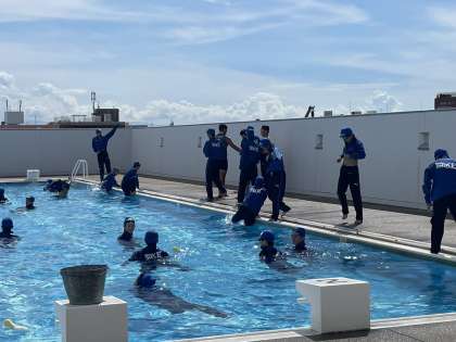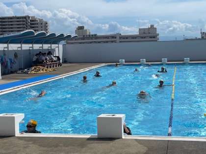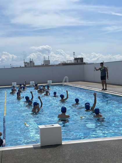 ?本日が体育の水泳授業最終日でした。2年生の授業風景ですが、水難事故を防ぐために着衣による水泳を行いました。