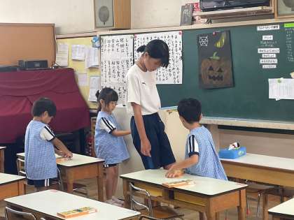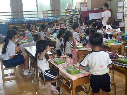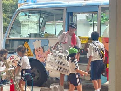 送迎バスのお出迎えや昼食を一緒に食べて中学生は大人気です。卒園生ということもあり、大活躍してくれています。