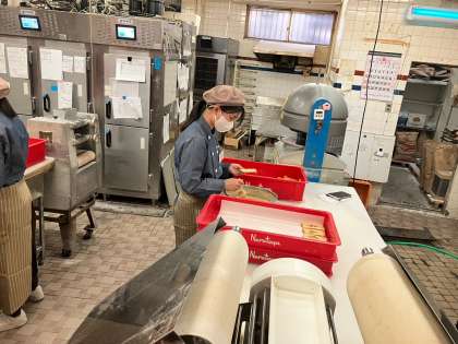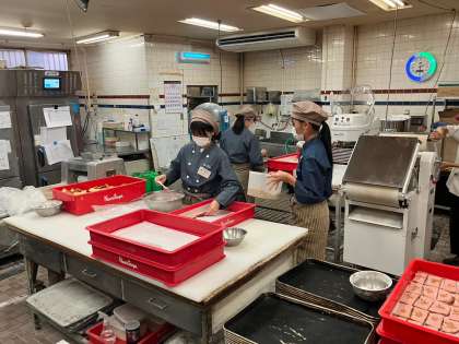 こちらはパン工房鳴門屋です。可愛い制服に身を包み、パンを作っている最中でした。表に出てパンを並べたり、レジ打ちをしてくれたりしていました。自分から「なにかすることはないですか?」と聞けた生徒もいてとても嬉しかったです。
