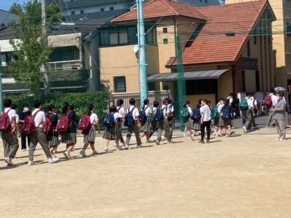 学級での活動を終え、全校生徒が運動場に集まり、居住地域ごとに集まって集団下校訓練を行いました。