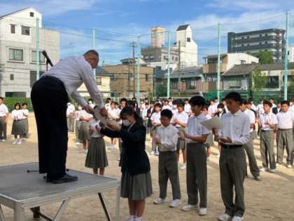 10月3日 後期生徒会役員認証式 公開日 2023/10/03 更新日 2023/10/03 お知らせ 今朝は少し暑さも和らぐ中、久しぶりに運動場で全校集会を行いました。 後期生徒会役員と学級委員の認証式で代表生徒に認証状を手渡しました。 全校生徒の1人ひとりに、役割りがあります。 活動しやすい季節に、みんなの力でより良い大池中学校をめざしましょう! いいね(0)