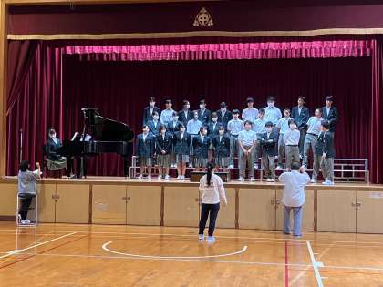 6時間目、総合の時間に2年生は体育館の舞台の上で合唱コンクールの練習をしていました。