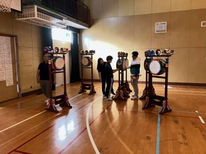 フロアの方では、運んできた両面太鼓を組み立てていました。保護者の方に協力していただいて、国際クラブで使う両面太鼓を近隣の中学校からお借りしました。本当にありがとうございます。何人もの先生たちに両面太鼓を運んだり組み立てたりするのを手伝っていただきました。協力し合って準備を進めるのは気持ちのいいものです。