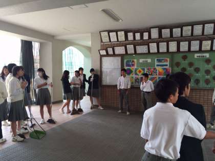 ボランティア清掃 公開日 2015/10/15 更新日 2015/10/15 お知らせ 今日は木曜日です。朝から、生徒会の呼びかけによるボランティア清掃の日でした。 朝、8時から8時25分ぐらいまで、一階玄関を中心に活動します。 画像は、終わりのミーティングの場面です。 いいね(0)