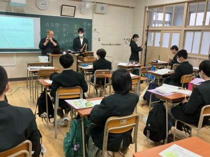 賑やかな音が聞こえるなと思ったら、1組では『音を宿す』という授業をされていました。実際に和太鼓などの楽器をたたいて体験していました。