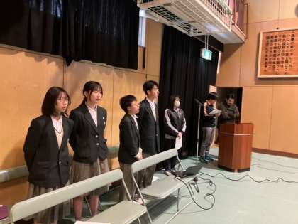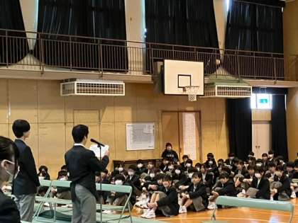 3月8日 3年生を送る会2 公開日 2024/03/08 更新日 2024/03/08 できごと 生徒会役員の代表が「お祝いの言葉」を送りました。3年生の代表の生徒から、後輩たちへ言葉を返していました。 いいね(0)
