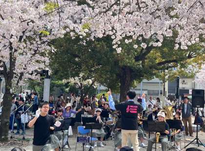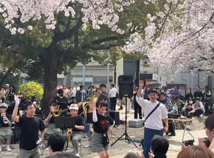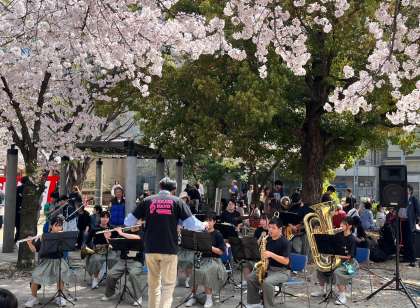 桜が満開に咲き誇る本日、御幸森さくらまつりが開催され、本校吹奏楽部が参加しました。見事な演奏で会場を盛り上げ、まつりに花を添えてくれました。