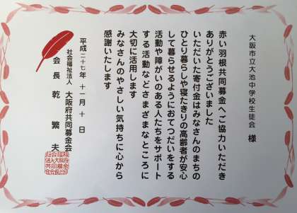 本校は、諸般の事情で永らく赤い羽根共同募金には参加できていませんでしたが、生徒会の発案で今年から参加することができました。今回集まった募金は、高齢者介護に使われるそうです。こうして、地域清掃活動などでない、こういう形の生徒達の社会貢献も今後も大切にして行きたいと思います。