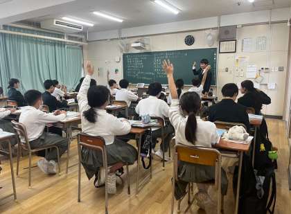 1年生の授業風景です。社会の様子です。実習の先生の授業に多くの人が手を挙げて積極的に参加していました。