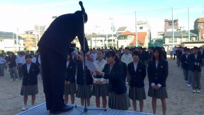 伝達式の後の全校集会では、校長先生から試合やコンテストの結果、『勝って得るもの』と『負けて得るもの』がそれぞれあり、それぞれ得るものが違うが、負けて得るものにこだわる大切さを講話されました。