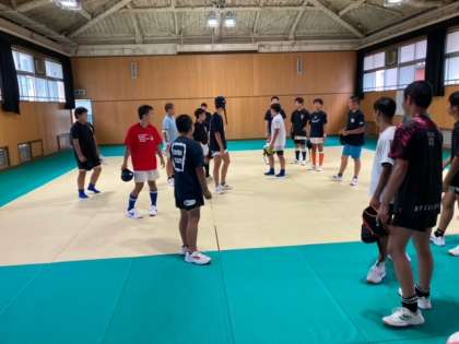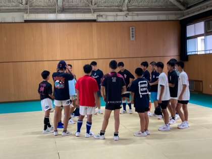 ラグビー部は武道室で練習後のミーティングを、テニス部は練習の合間の休憩をしています。
