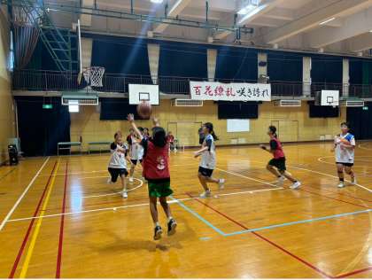 夏休みも残り少なくなってきました。暑い日が続きますが、部活も頑張っています。外では、サッカー部が練習試合、体育館では女子バスケット部が小学生を招いて練習に励んでいます。それぞれの目標に向けて、努力している姿はやはりいいものです。
