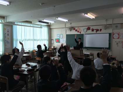 2時間目は「公務員への道」、「目指せなにわの商人」、「サッカー講座」、「マナー講座」、「バレーボールをやってみよう」、「身近なサイエンス」の6つの講座に分かれ、高等学校の先生による授業を受けました。みんな興味津々に受講していました。