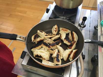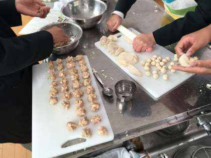本日2年生のあるクラスは調理実習で餃子と中華スープを作りました。みんな黙々と手作りの餃子の皮で具を包んでいました。