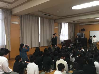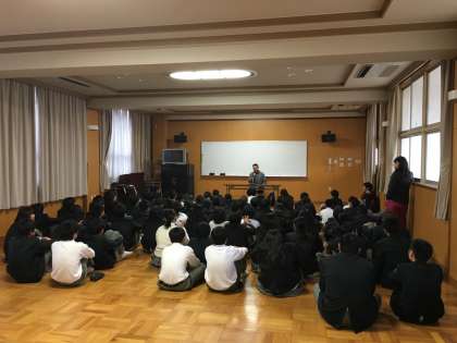 今日は1年生は視覚障がいがあり、点字図書館で勤務している方に来ていただき、日常生活や介助の方法、点字について話を聞きました。