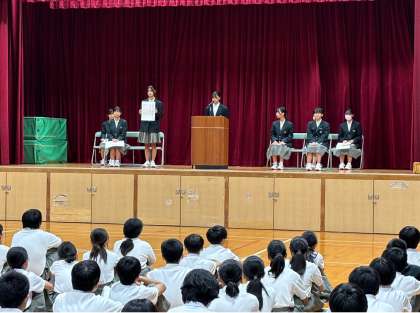 本日、生徒会立会演説が行われ、後期生徒会を担う生徒とその応援演説者の皆さんが全校生徒の前に立ちました。それぞれが自分の言葉で思いを伝え、聞く側も真剣に聞いていました。大池中学校の生徒会のバトンも3年生から後輩達に無事に引き継がれそうです。