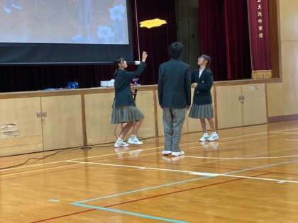 中国語クラブは中国に関する紹介に織り交ぜて中国語でのあいさつや、中国の遊具を使った芸を発表してくれました。