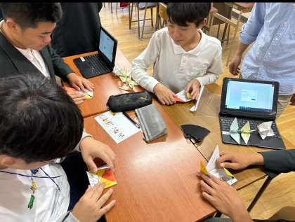 最後は希望者が集まっての交流です。本校からは62名の生徒が参加しました。韓国のメンコを一緒に作って楽しんでいます。コミュニケーションも身振り手振りやタブレットを駆使しながら一生懸命とっていました。どこのグループもすぐに仲良くなっていました。コミュニケーション力に驚かされます。