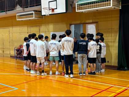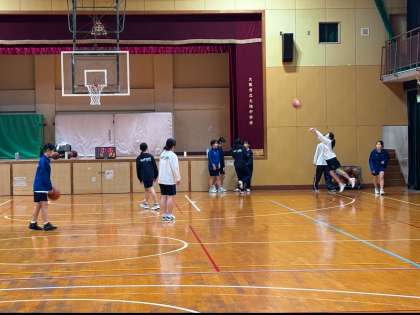 体育館では、男子バスケット部と女子バスケット部が練習に励んでいます。