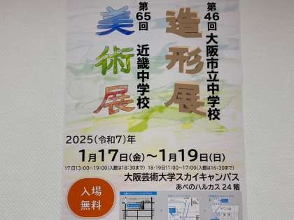 1月17日 大阪市立中学校造形展 公開日 2025/01/17 更新日 2025/01/17 お知らせ 今日から、あべのハルカス24階の大阪芸術大学スカイキャンパスにて、大阪市立中学校造形展が開催されます。 中学校美術科の立体作品展として、本校生徒作品も出展されています。 1月19日(日)までの期間です。 いいね(0)