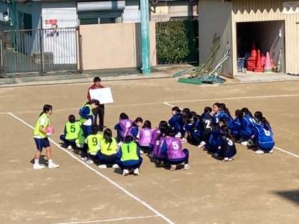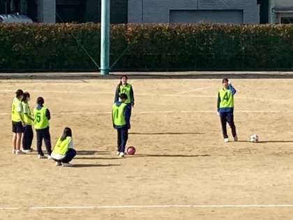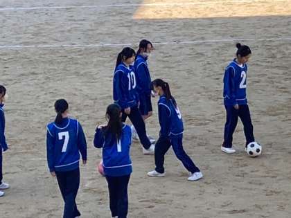 3年生女子の保健体育科授業風景です。 運動場でサッカーに取り組んでいます。