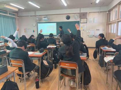 1月24日 1年生授業風景 公開日 2025/01/24 更新日 2025/01/24 できごと 1年1組は国語の授業です。創作文を作成し、生徒同士で作品に投票しています。中には、詩人を思わせる素晴らしい作品もありました。 1年2組は英語の授業です。2組の英語の発声はとにかく大きく積極的です。 1年3組は社会の授業です。地理の学習に取り組んでいます。手があがる数が多く、積極性は負けていません。 いいね(0)