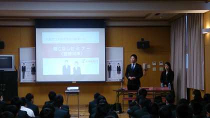 菅公学生服の方に講師で来ていただき、「面接対応セミナー」を行いました。明日からはいよいよ受験の際の面接試験と将来に役立てる目的で3年生全員が校長面接を行います。今日教えていただいたことを活かしてしっかり準備をしていきましょう。頑張れ69期生!
