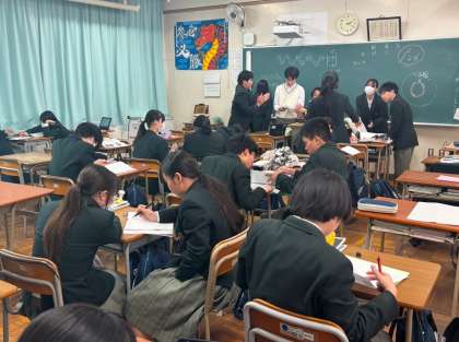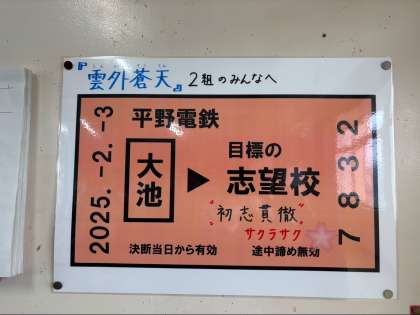 3年生の授業風景です。いよいよ迫った私立入試に向けて、各自のペースで教え合いながら試験問題に取り組んでいます。それぞれのクラスからは緊張感が感じられました。とにかく、自分のベストを発揮してほしいと思います。クラスにはこんな切符が掲示されています。志望校に向けて、切符を手に入れた皆は大丈夫!!頑張れ、3年生!
