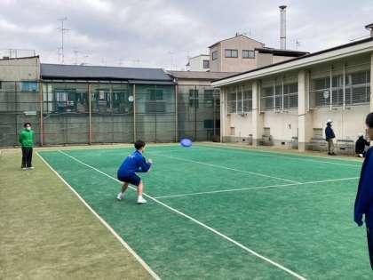2年生男子は、テニスコートでフリスビーの実習中です。