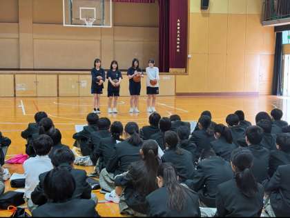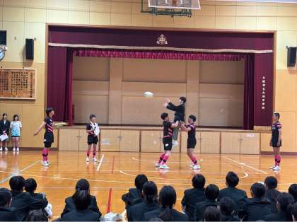 本日、1年生に向けて部活動紹介が行われました。アート&クラフト部、パソコン部、吹奏楽部、男子バスケット部、女子バスケット部、バレー部、テニス部、サッカー部、ラグビー部