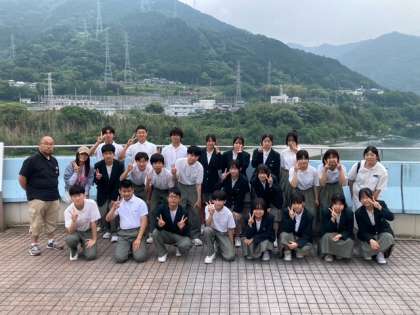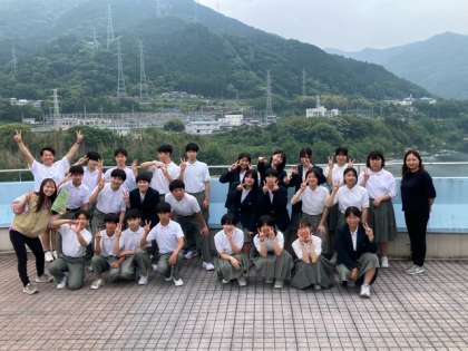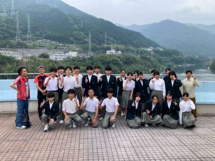 吉野川を背景に記念撮影です。