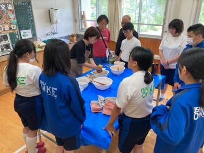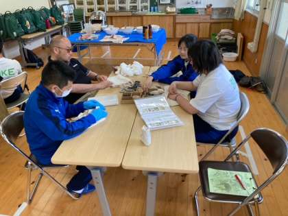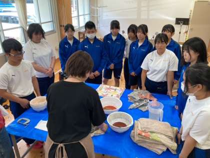 べんがら染め体験の活動風景です。 説明を聞いて、アイデアを考えます。