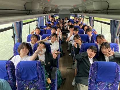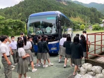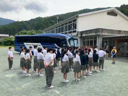 お礼のあいさつの後、バスに乗車です。 大池中学校を目指して出発です。