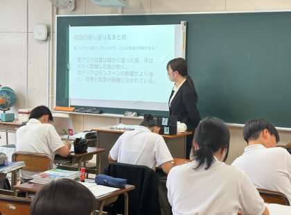 1年1組は社会の授業です。実習生が授業をしています。実習生が時間をかけて準備をした教材に向かって一生懸命勉強している光景が見られます。