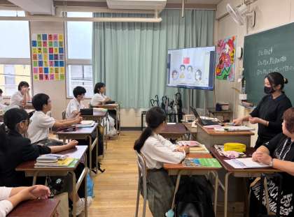 1年2組は英語です。リスニング教材を使って、勉強しています。五感を大切に、英語に触れています。