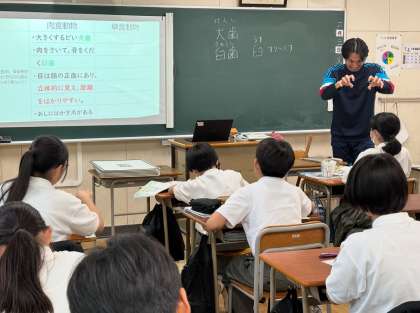 1年3組は理科です。肉食動物と草食動物の違いを身振り手振りを使って学習しています。どのクラスも頑張っています。