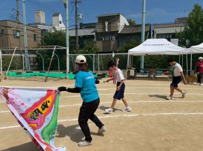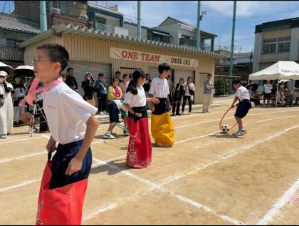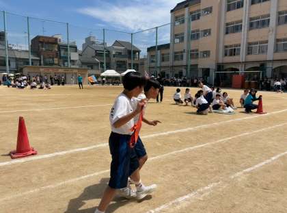 1年生学年種目です。『大池さるかに合戦』様々な課題をクリアしながら襷を繋ぎます。