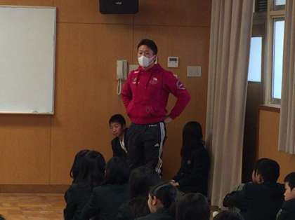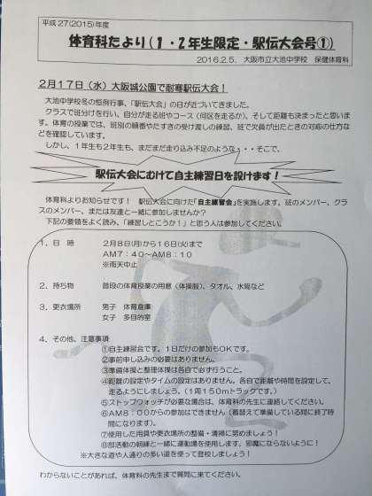 2年3組の担任で、体育科の米元先生から来る2月17日に開催される、大池中耐寒駅伝大会に向けてお話がありました。