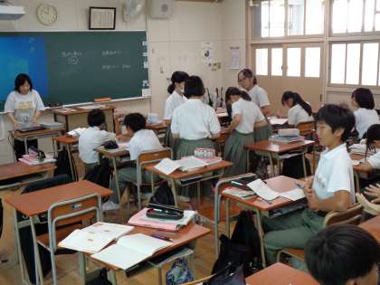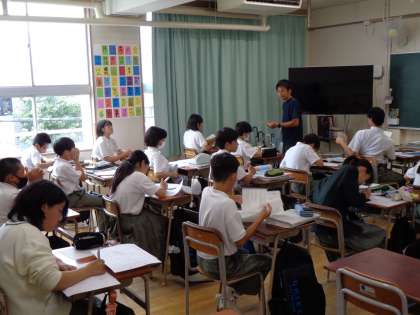 2組は社会科で二学期の課題テストについて説明を聞いています。