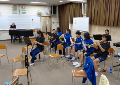 吹奏楽部は次の発表に向け、一生懸命練習しています。楽器の音が校内に響いています。