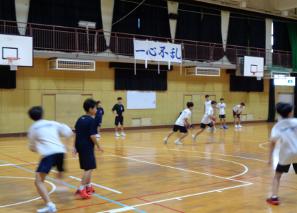 体育館では、バスケット部が活動しています。男子は明日、府大会3回戦に臨みます。ベストを尽くせるよう応援しています。女子バスケット部も頑張っています。選抜大会、秋の大会に向けて、活気ある練習に取り組んでいます。