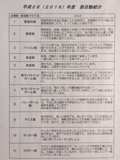 部活動紹介 其の一 公開日 2016/04/12 更新日 2016/04/12 お知らせ 今日の6時間目、体育館にて新入生に向けて、大池中の11のクラブが生徒会の司会で、部活動紹介を行いました。 『中学生に成ったら、何をしたいですか?』 のアンケート結果のダントツ1位は、何と言ってもクラブ活動という現状から、新入生もこの日を楽しみにしていたことでしょう。 画像は部活動紹介プリント、生徒会の司会の様子、家庭科部の活動紹介です。 いいね(0)