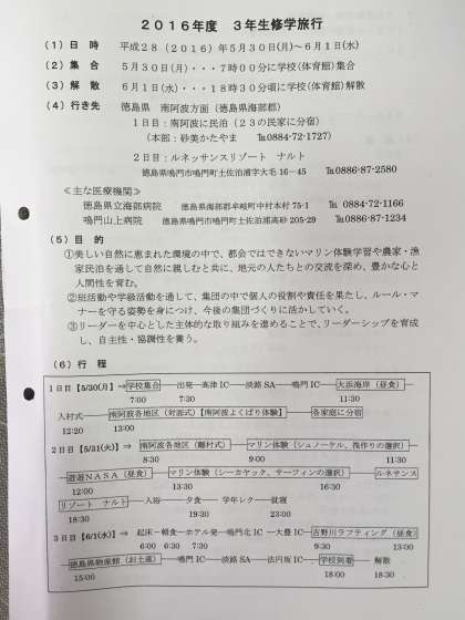 5月30日から3年生が修学旅行に徳島県南阿波方面へ出かけます。