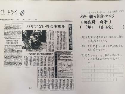 朝学習は、毎日各教科からプリント課題が出されて、1時間目が始まる前に実施しています。学習モードへの切り替えの意味もありますが、この社会科の取り組みは、単に朝の学習で終わるのではなく時事問題を新聞記事をもとに出題し、社会科の授業での冒頭に時事問題を取り上げた授業として、文章の読み取り方や、自分の意見のまとめ方までを教えています。